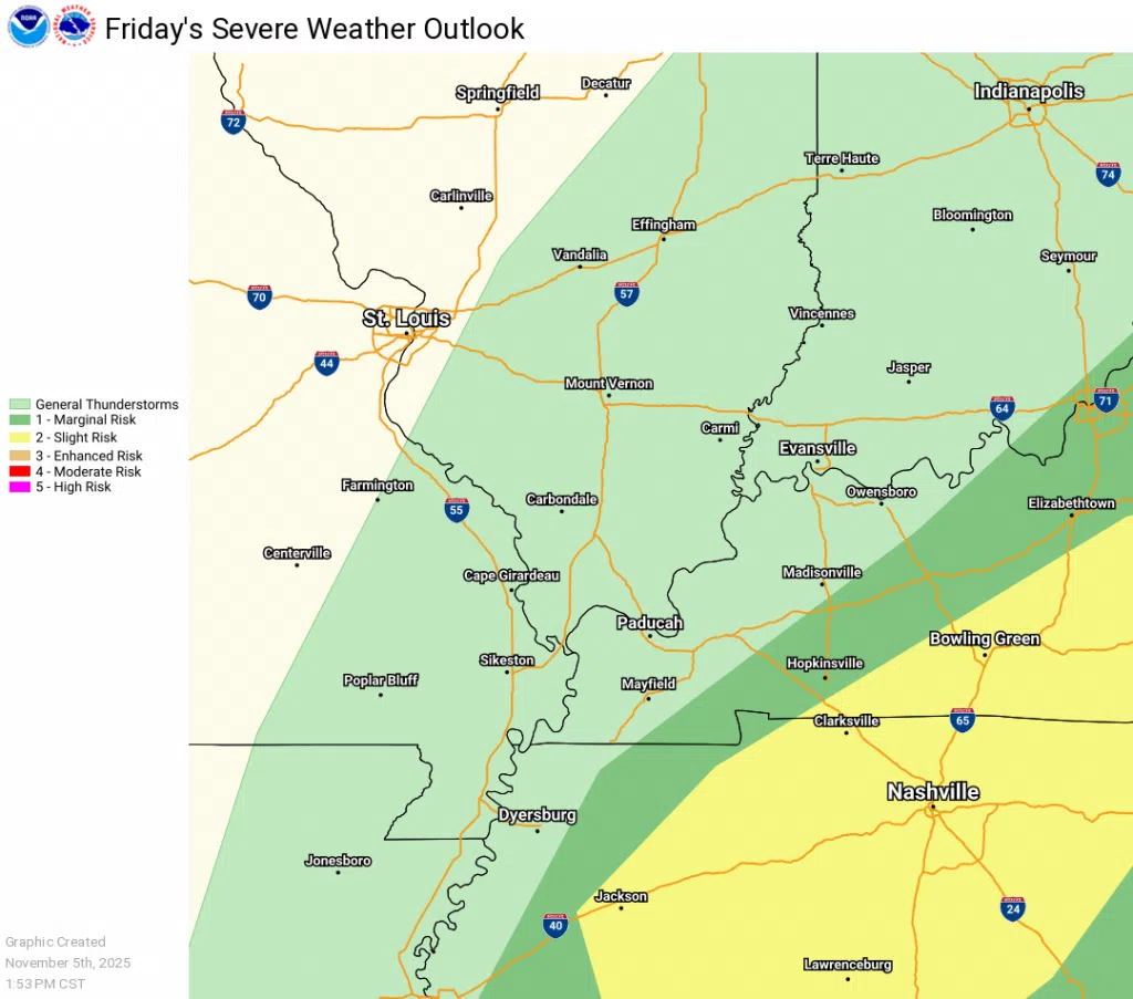 “For Friday, SPC has outlooked some of the southern KY Purchase and KY Pennyrile under a marginal risk (level 1 out of 4) of severe thunderstorms. Looking at the latest model data, the severe risk looks very low to our region, with the better ingredients staying south and east in western and middle Tennessee and southern Kentucky. That being said, a few thunderstorms are forecast during the morning and afternoon hours, but conditions will improve from northwest to southeast during the afternoon and evening hours. ”