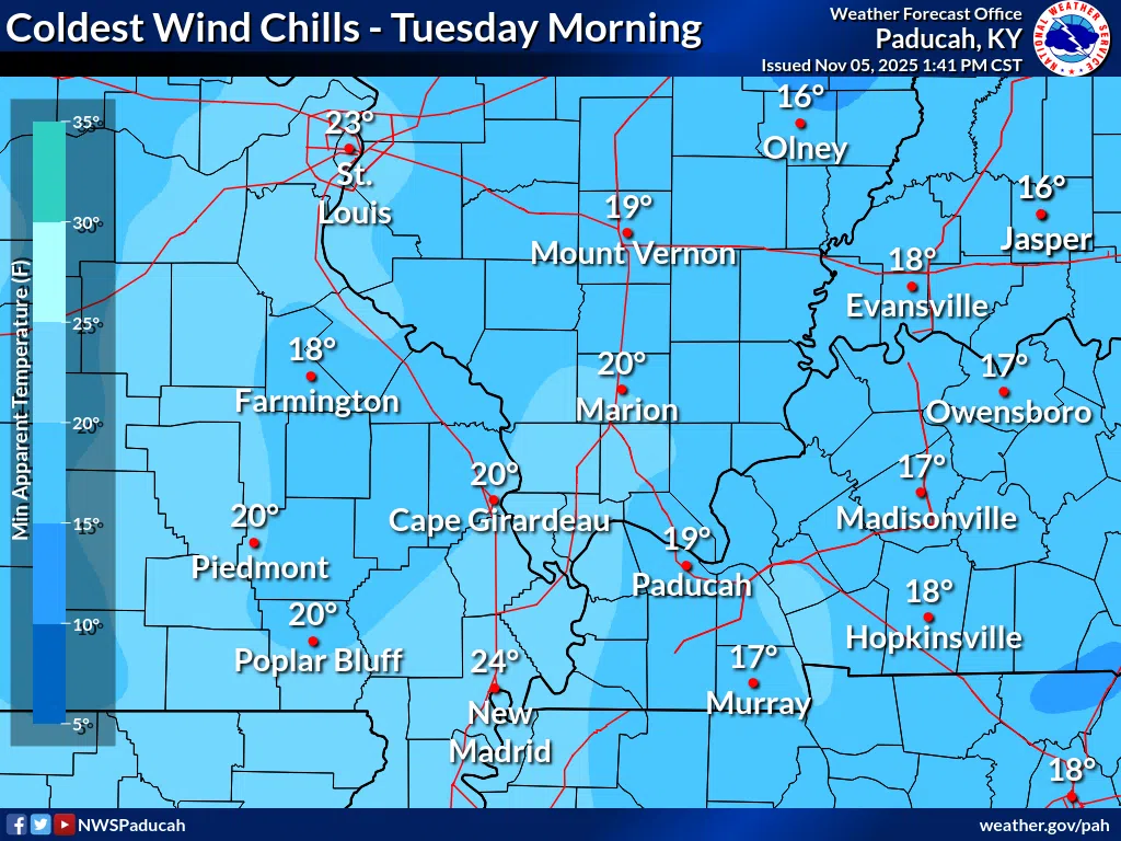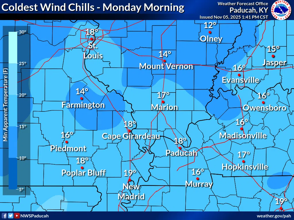 Looking ahead to early next week, a blast of chilly Arctic air will bring the coldest temperatures of the season Sunday through Tuesday. Morning low temperatures Monday morning and Tuesday morning will fall into lower to middle 20s. Wind chill values of 10 to 20F are forecast Monday morning and 15 to 25F on Tuesday morning. These values may be low enough to trigger the opening of white flag shelters. Additionally, we cannot completely rule out seeing a few flurries Monday afternoon in southern and southwest Indiana!