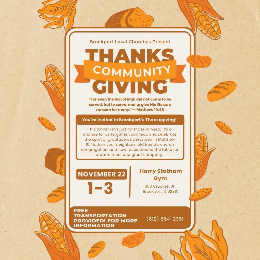 You’re invited to Brookport’s Thanksgiving! This dinner is not just for those in need, its a chance to gather, connect, and celebrate the spirit of gratitude.