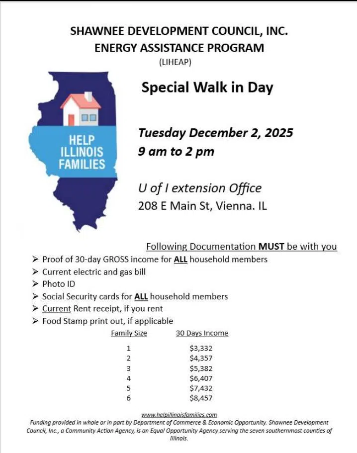 –Joppa Distribution – 10A-12P – Civic Center next to Joppa City Hall. Every 3rd Saturday a month. Please bring your photo I.D. and proof of Massac County residency. (618) 524-3635.