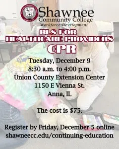 Shawnee Community College is proud to announce a basic life-saving CPR course designed specifically for healthcare providers. The course will take place on Tuesday, December 9, from 8:30 a.m. to 4:00 p.m. at the Union County Extension Center in Anna. This essential training aims to equip healthcare professionals with t...