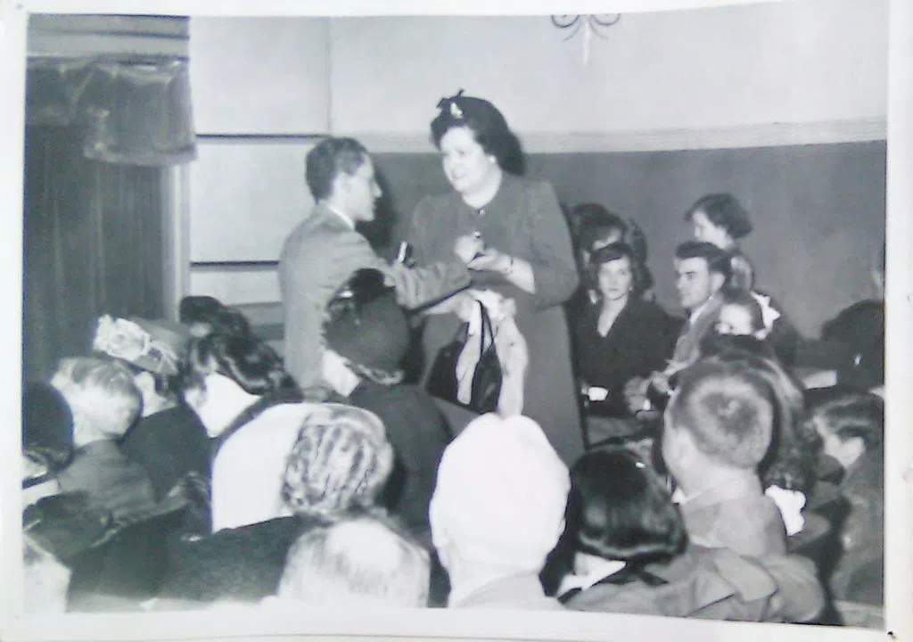 Jay Riley interviewing and giving silver dollars to youngest grandmother in the audience, Mrs Lena Ashby during broadcast of WMOK dedication program from Massac Theater – February 4, 1951