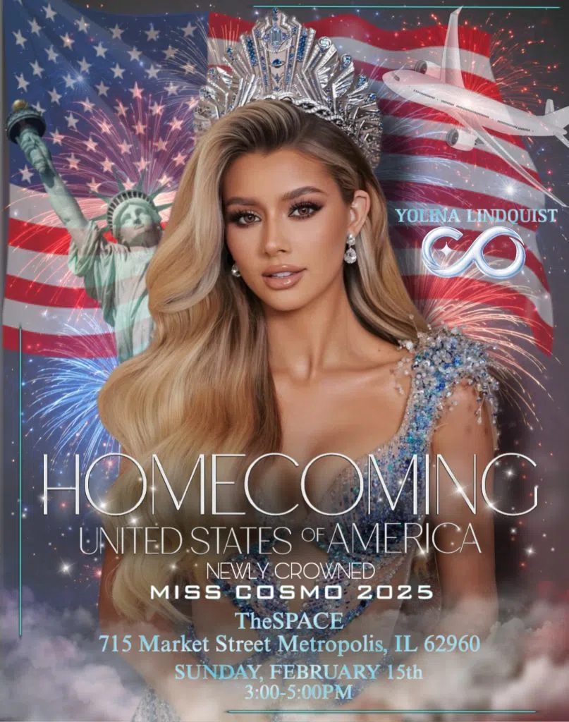 Metropolis, Illinois – On February 15th, the community of Metropolis will roll out the red carpet for one of its own as Yolina Lindquist returns home after being crowned Miss Cosmo International. The highly anticipated homecoming event will take place at The Space, located at 715 Market Street, from 3:00 to 5:00 PM.