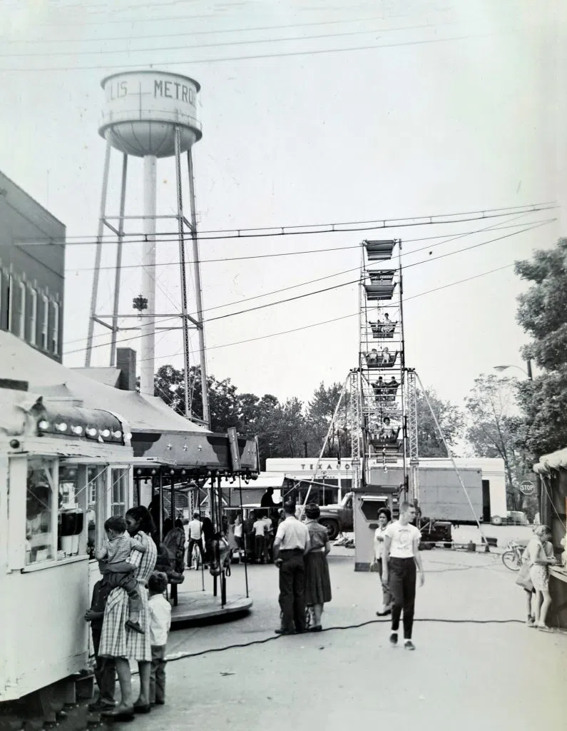 Published on the Metropolis and Massac County History Page by Barbara Story, this photo captures the Metropolis Carnival – near Massac County Courthouse – 1950s or 1960s