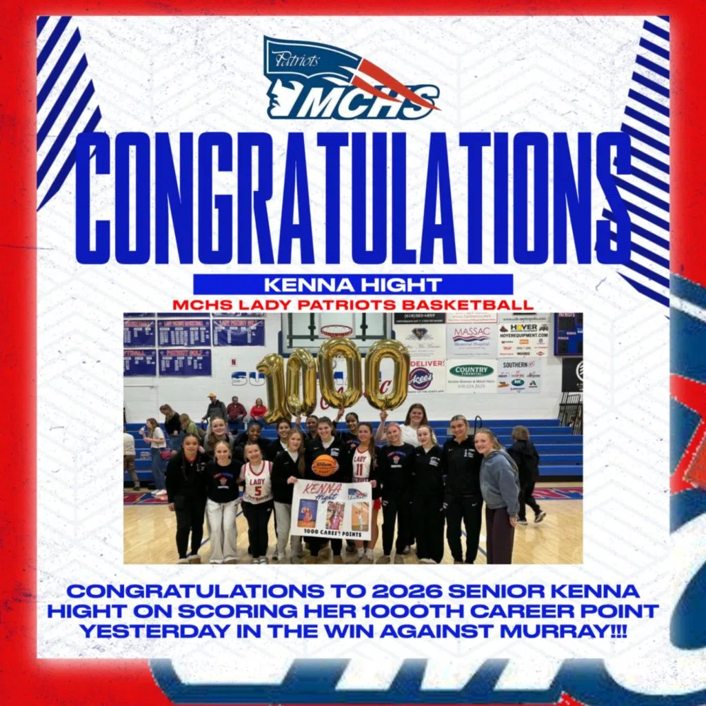 (WMOK) In an impressive display of skill, senior MCHS Lady Patriot basketball player #24 Kenna Hight reached the milestone of 1,000 career points during a victorious game against the Murray Tigers. Congratulations to Kenna on this remarkable achievement and for her outstanding contributions to high school basketball!